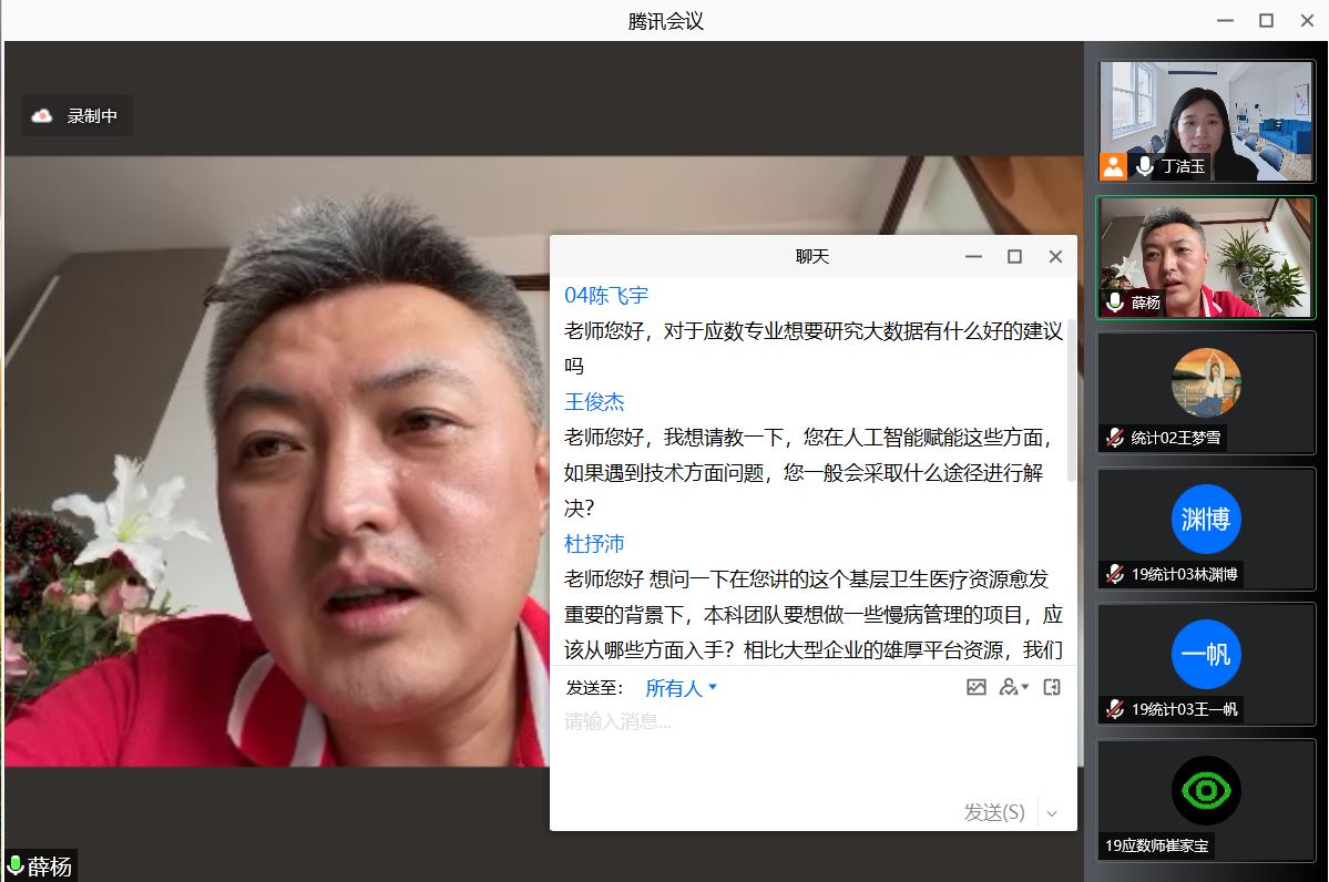 140余名本科生、研究生和教师参加了本次报告,并与薛教授进行了热烈交流。薛杨教授逐一回答了学生提出的问题,对数学专业学生进行人工智能方面学习和实践提出了建议,并欢迎同学们参与健康医疗前沿领域研究实践。