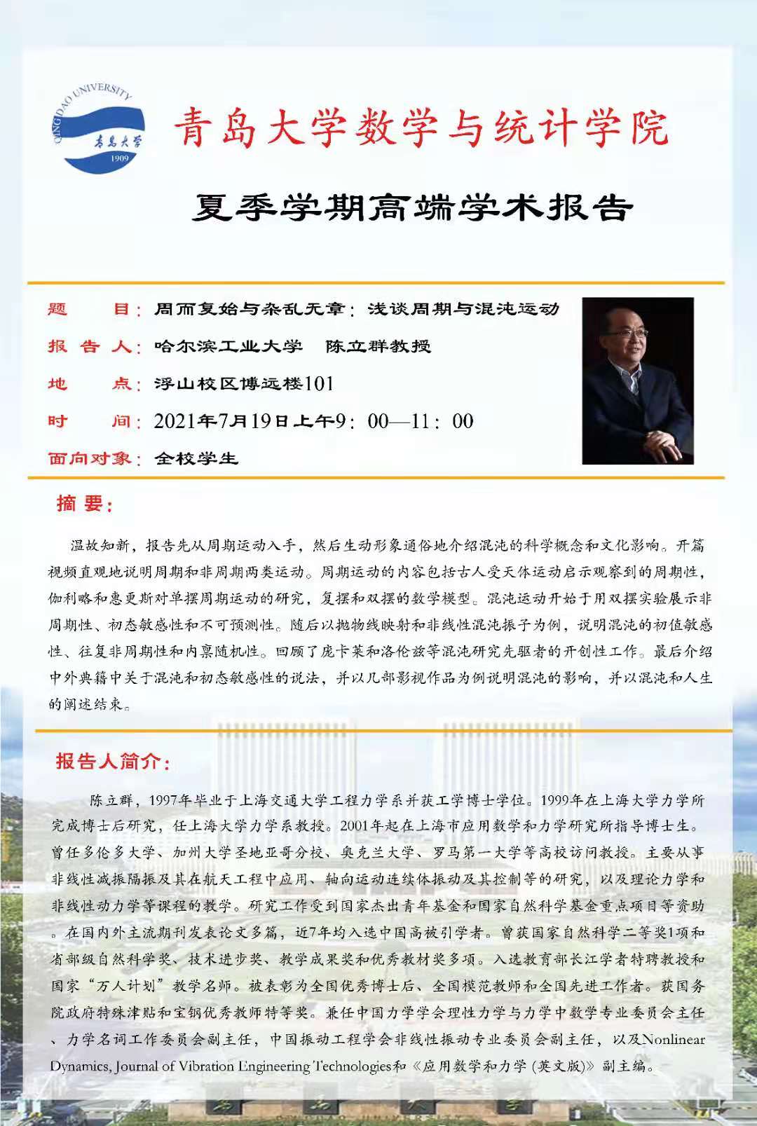 夏季学期第六场高端学术报告在博远楼101教室举行,来自哈尔滨工业大学的国家杰出青年科学基金获得者、教育部长江学者特聘教授、国家“万人计划”教学名师陈立群教授为全校师生作了“周而复始与杂乱无章:浅谈周期与混沌运动”的通识教育类高端学术报告,黄漫