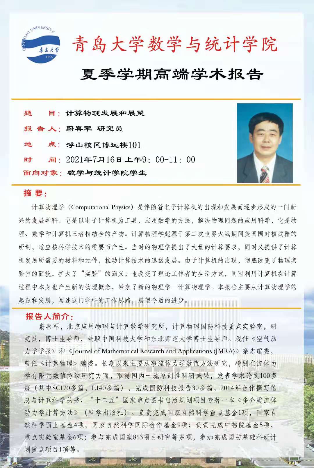 夏季学期第四场高端学术报告在博远楼101教室举行,来自北京应用物理与计算数学的蔚喜军研究员为黄漫