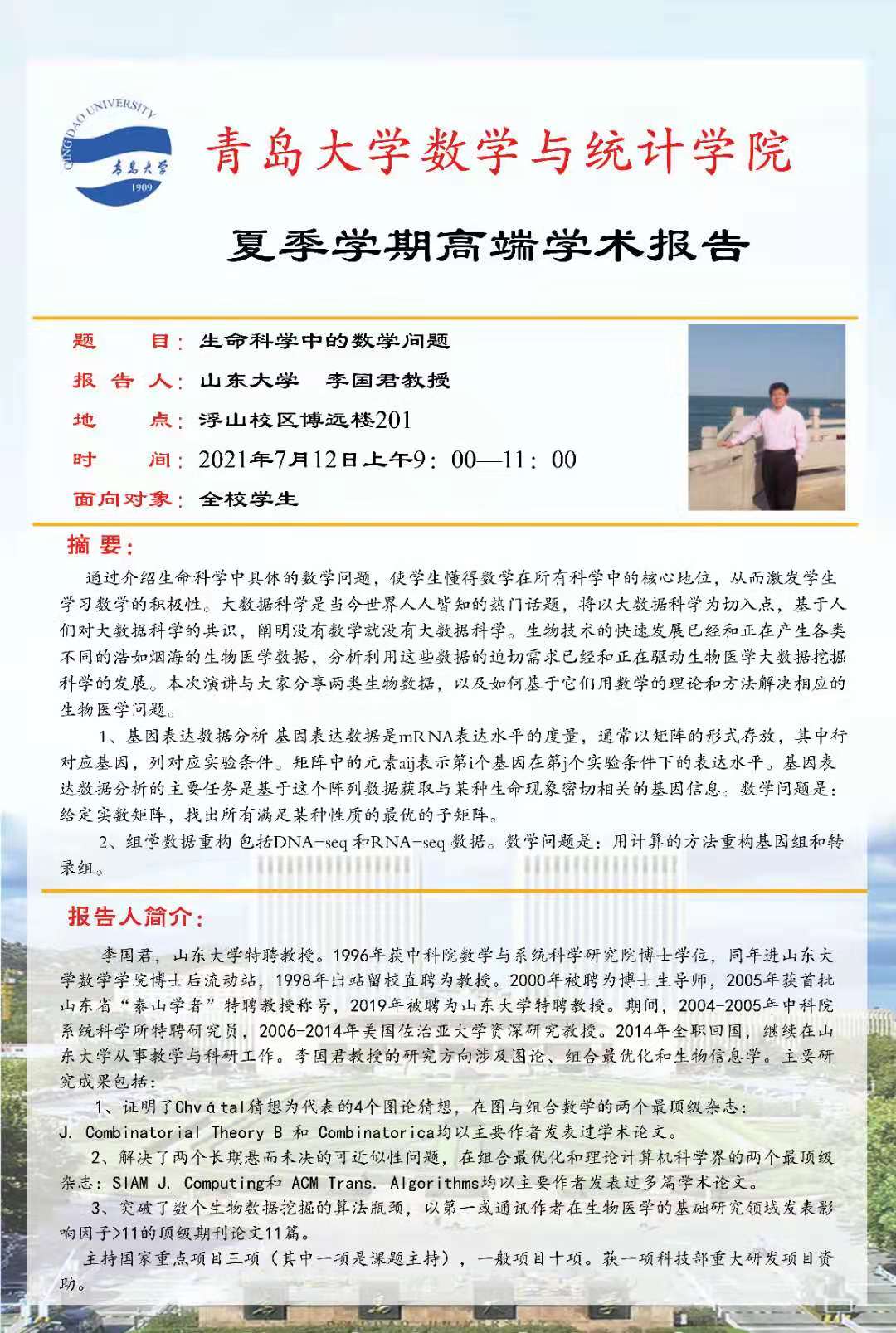 夏季学期第二场高端学术报告在博远楼201教室举行,来自山东大学的泰山学者李国君教授为黄漫