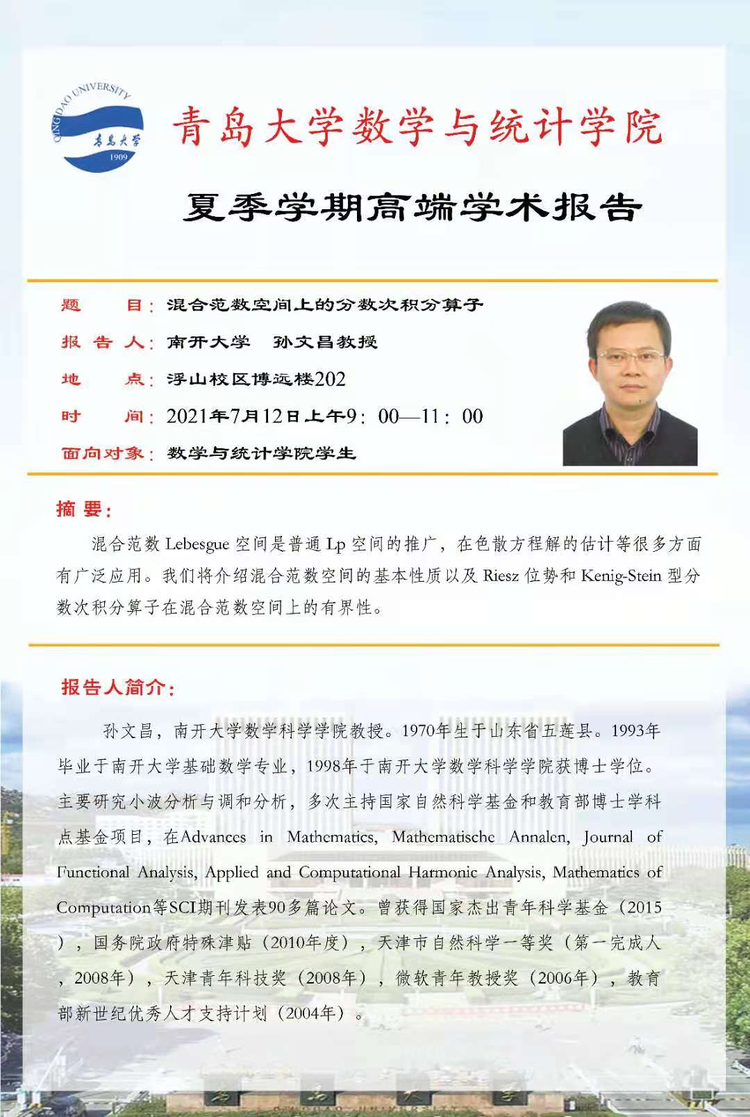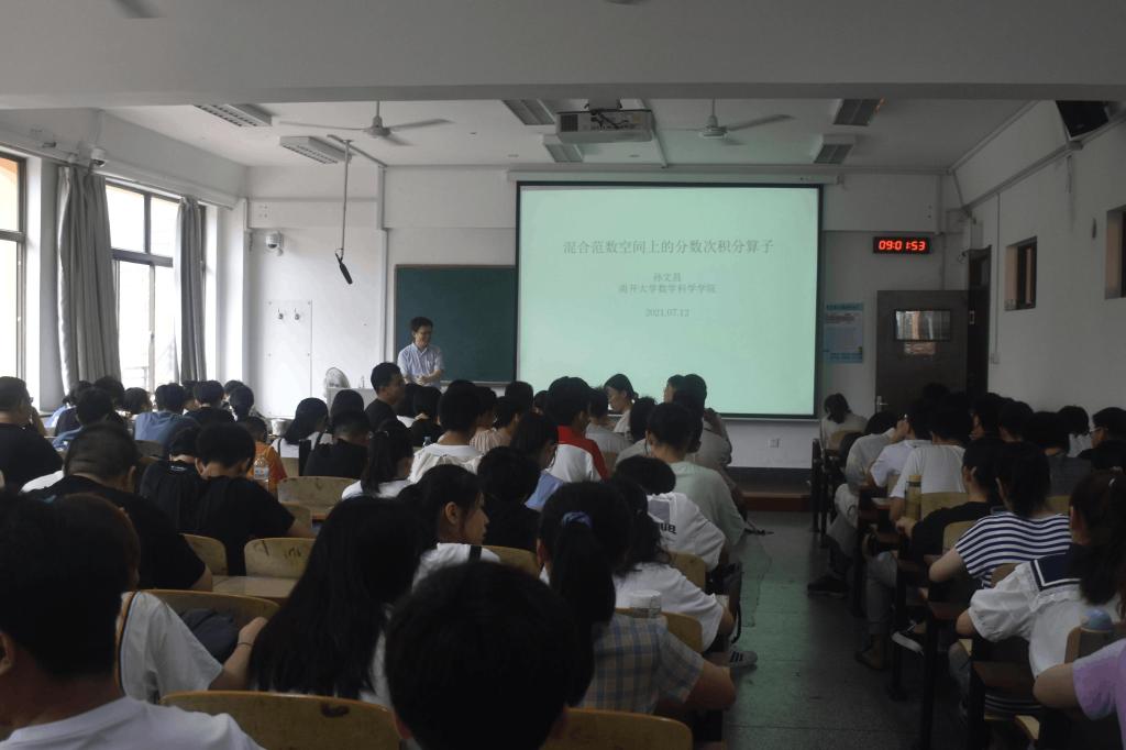 2021年7月12日9:00-11:00,黄漫 夏季学期第一场高端学术报告在博远楼202教室举行,来自南开大学的国家自然科学杰出青年基金获得者孙文昌教授为黄漫 师生作了题为“混合范数空间上的分数次积分算子”的学术报告,介绍了混合Lebesgue空间的发展历程和研究现状,以及若干最新的研究进展。
