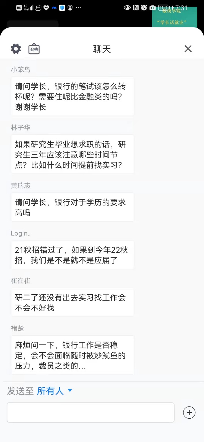 聊天会围绕企业就业、考公和事业编、考教师编三个就业话题开展。段金鹏首先分享了求职所需技能和简历制作要点,结合自己在银行工作的经历,对有意应聘银行等单位的同学给出了中肯的建议。韩世涛分享了在公务员事业编考试方面的心路历程,对公考的报考时间、科目等常见问题进行了阐释。任职初中教师的刘晓莉则全面的讲解了考教师编的注意事项,分享了自己的工作心得。