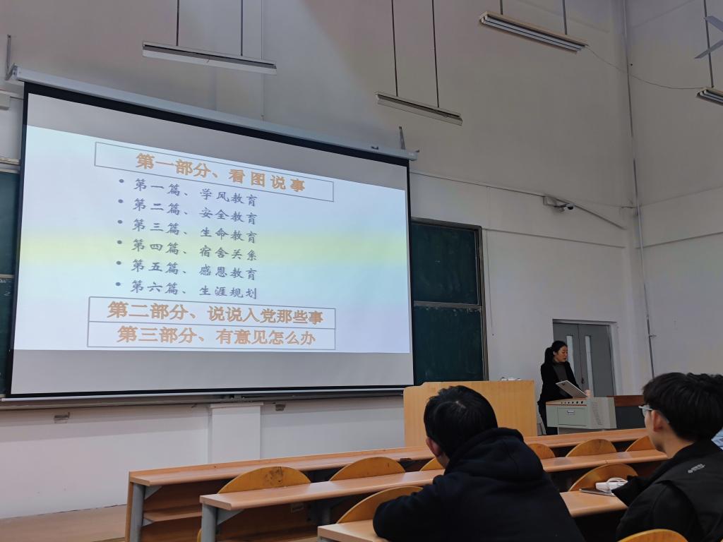 张雪蕾书记用内容丰富的幻灯片,首先从学风教育、安全教育、生命教育、宿舍关系、感恩教育、生涯规划共六个方面给大一新生展开全面详细地讲解,并结合多个实例为大一新生敲响警钟,也树立了优秀的榜样。在大会中,张雪蕾书记强调,大学生要学会生活自理、管理自制、思想自我教育、学习高度自觉,培养自学、敏捷思维、组织管理、周全表达的综合能力,在大学完成"做人、做事、做学问"的终极目标,并为自己的四年大学尽早做出适合自己的生涯规划。