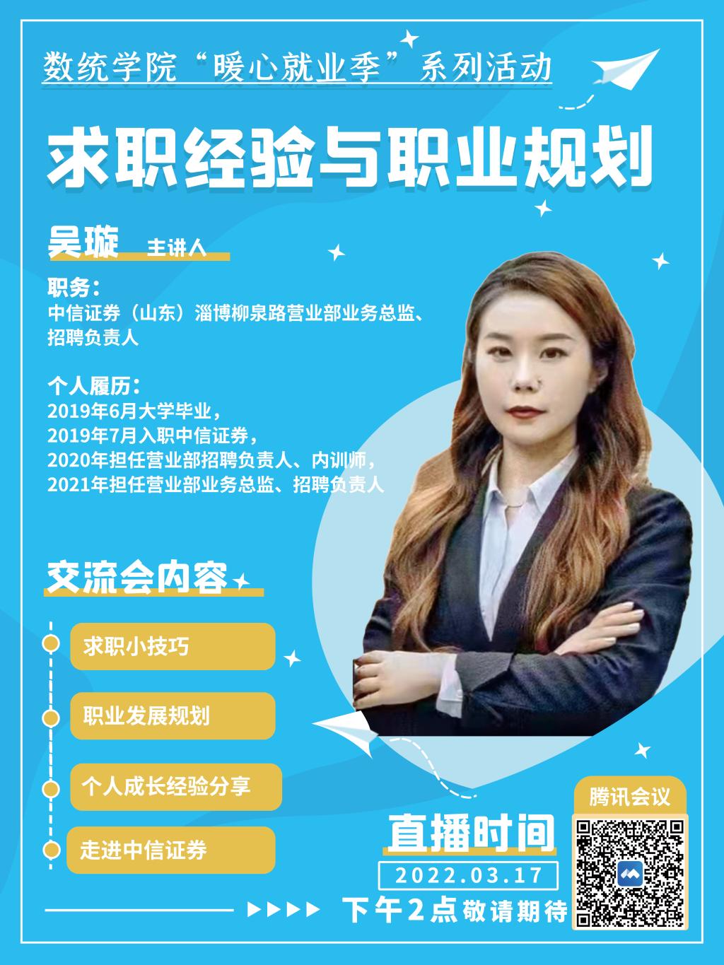 举办“暖心就业季”系列之“求职经验与职业规划”讲座。中信证券(山东)淄博柳泉路营业部HR吴璇总监主讲。学院党委副书记张雪蕾主持,黄漫