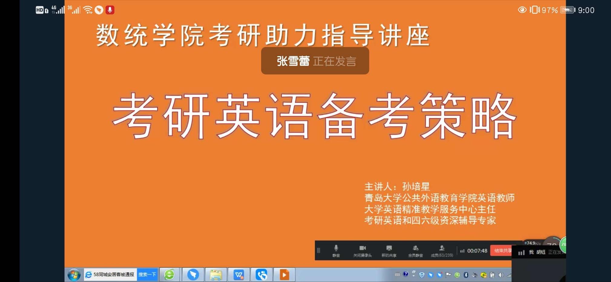 以钉钉线上视频的方式举办第一期“考研助力”主题讲座之考研英语备考策略讲座。公共外语教育学院大学英语精准教学服务中心主任、考研英语和四六级资深辅导专家孙培星老师主讲,2017级考研学生和部分备考六级的同学参加,讲座由学院党委副书记张雪蕾主持。