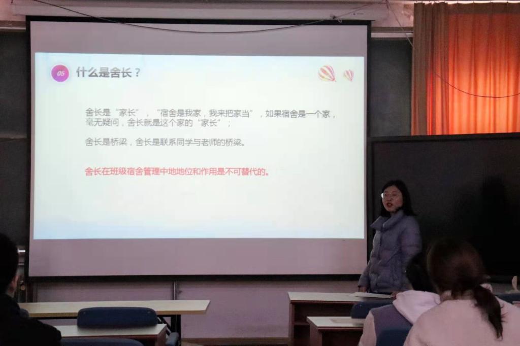 朱雨彤从自身本科经历出发,将自己的真实故事和心得感悟同舍长们分享,为舍长们管理宿舍提供了宝贵的经验,随后分析总结了上学期宿舍成绩及宿舍评比结果。会议中间播放了小视频,有舍员们对舍长肯定和支持的评价,也有舍员们对舍长的感恩和祝福的话语,让舍长们感受到了舍员们的真情实意,也让同学们体会到宿舍内温暖的情意。她同时强调了宿舍内的安全隐患排查和防诈骗问题,要求舍长们要尽职履职,当好“当家人”,带领同学们共同营造“我的宿舍我的家”温馨氛围。