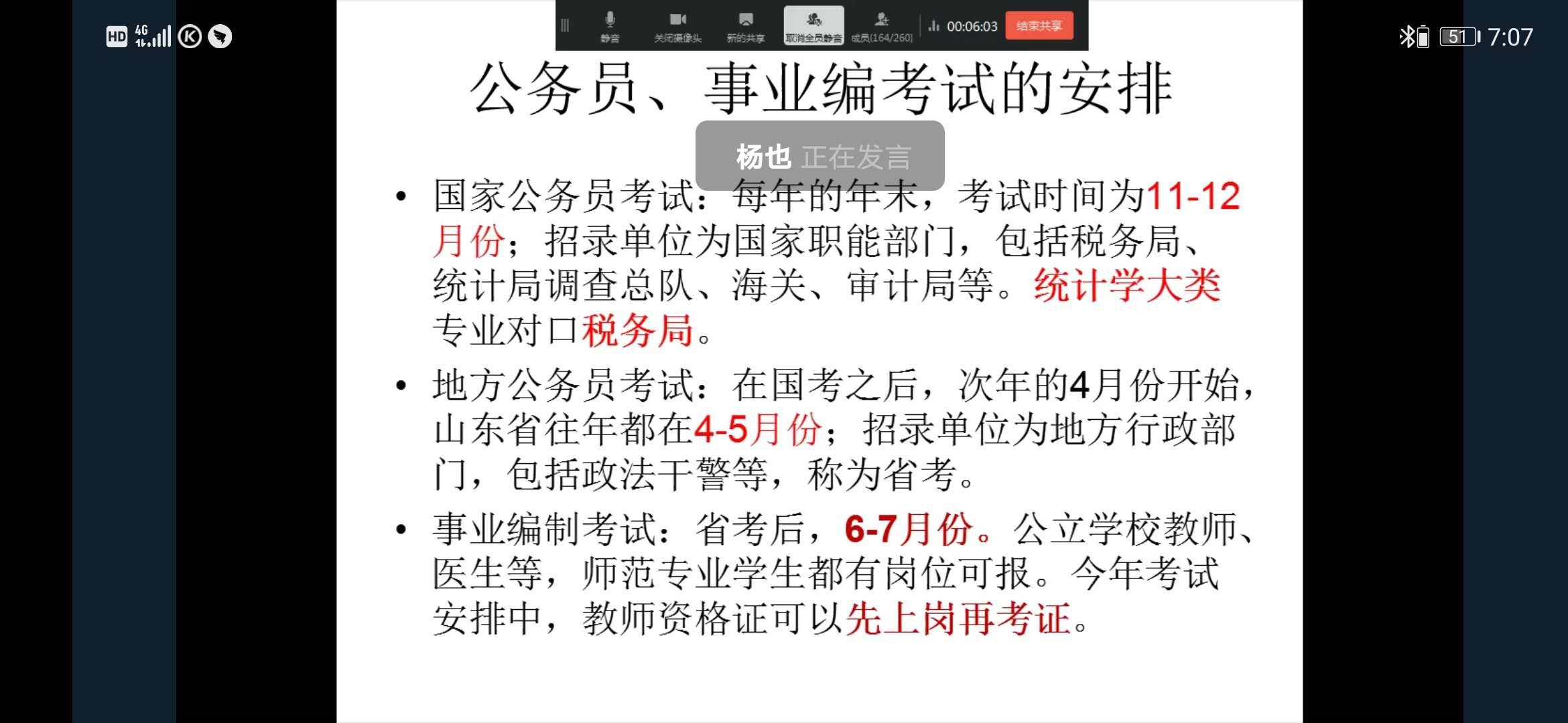 杨也通过PPT向同学们分享考试经验。他首先介绍了公务员、事业编考试的安排,特别强调了应届毕业生身份的优势,提醒同学们提前规划,明确目标。