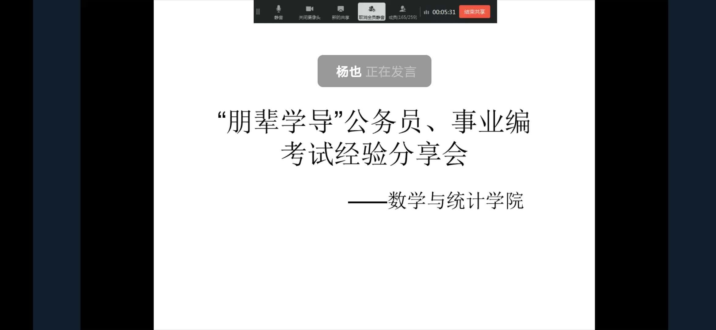 以腾讯会议的形式举办“朋辈学导”之公务员、事业编考录经验分享会。本次分享会由2020届毕业生杨也主讲。