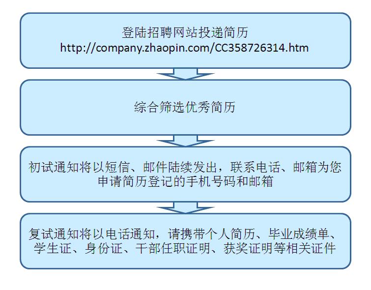 (二)简历投递截止时间2014年11月23日20:00,初试通知将以短信、邮件陆续发出,联系电话、邮箱为您申请简历登记的手机号码和邮箱。