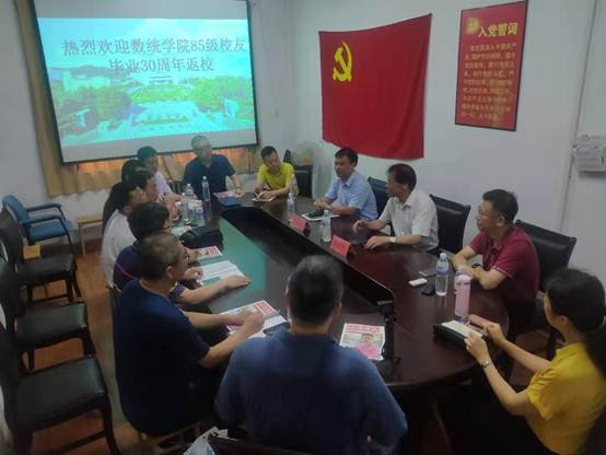 在励行楼218会议室举办85级校友毕业30周年返校座谈会,学院党委书记姜永杰、副书记、院长高红伟、党委副书记张雪蕾、85级校友、现任青大数据科学与软件工程学院党委书记郭振波等十名校友参加座谈会。会议由校友代表郭振波主持。