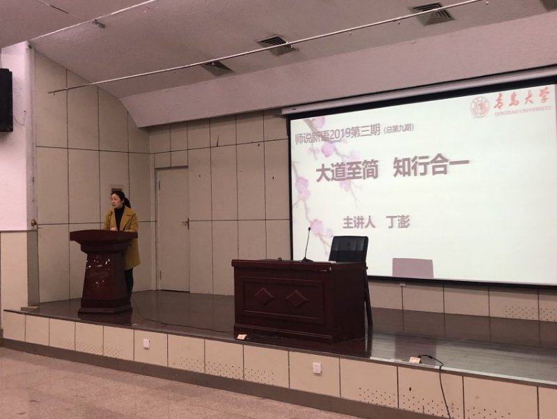 在浮山校区图书馆报告厅举办“师说新语”2019年第三期活动,学院优秀校友丁澎做了“大道至简,知行合一”的主题讲座,学院党委副书记张雪蕾参加并主持,学工办主任李玲慧及2017级全体学生参加。
