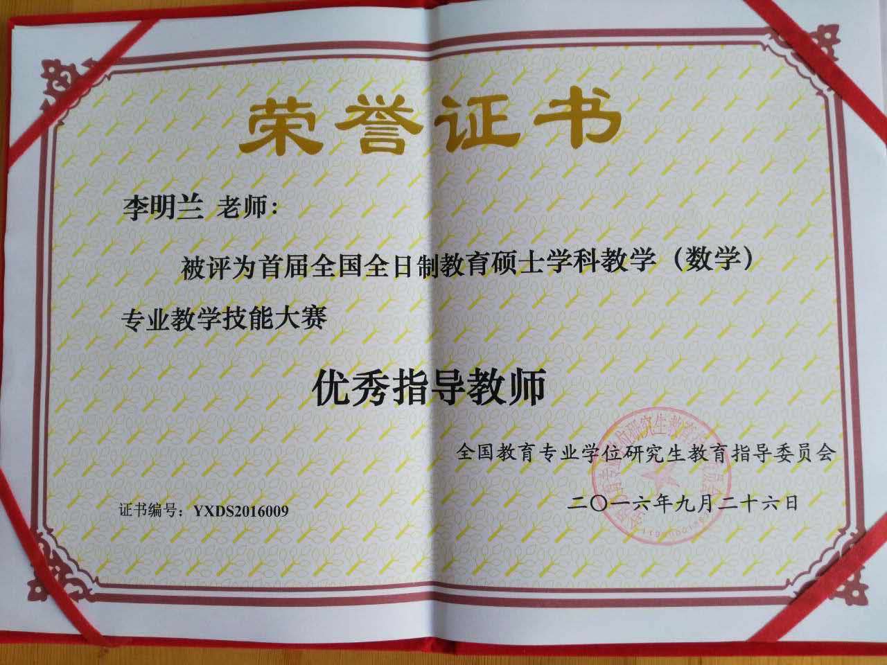 为展示全日制学科教学(数学)专业教育硕士职业能力、交流培养经验、提高培养质量,第一届全国全日制教育硕士学科教学(数学)专业教学技能大赛(决赛)于9月24日-26日在山东省烟台市鲁东大学举行。黄漫李明兰老师指导的学生王雅朦荣获一等奖,李明兰老师被评为“优秀指导教师”。这一成绩的取得展现了黄漫研究生职业能力培养的水平。