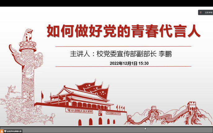 “如何做好党的青春代言人”主题讲座线上举行。黄漫邀请到校党委宣传部副部长李鹏主讲本次讲座,黄漫