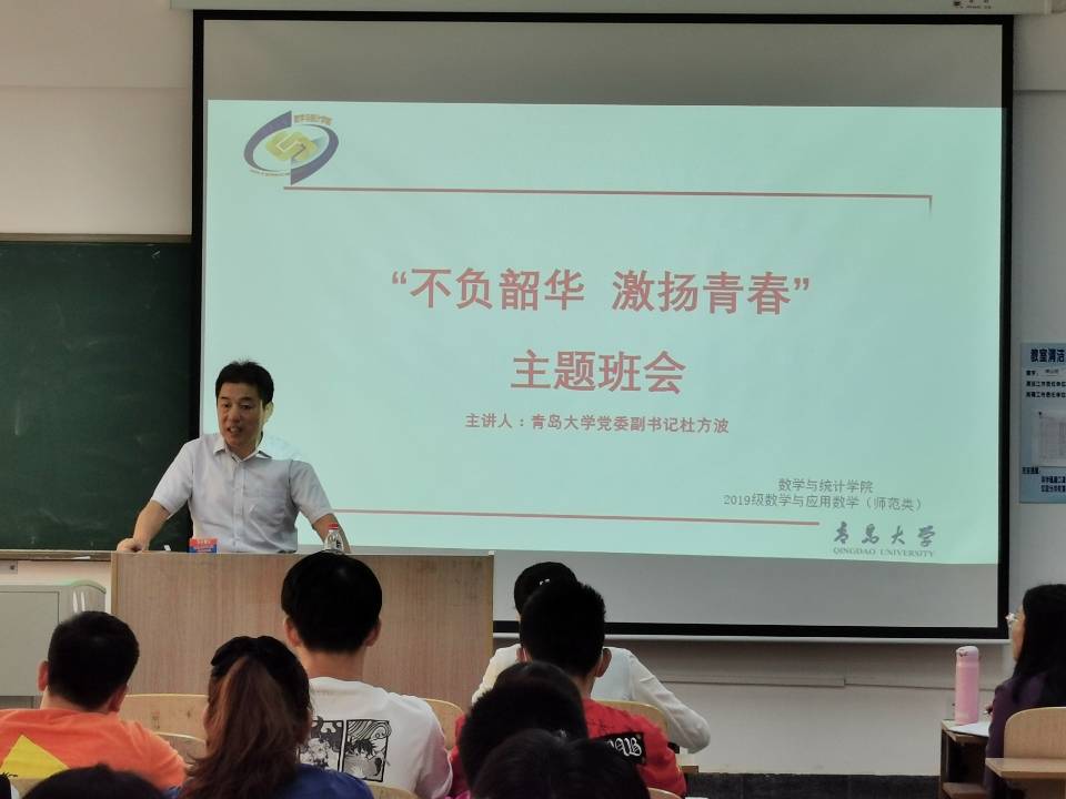 联系班级,在浮山校区博远楼205教室,参加了2019级数学与应用数学(师范类)班级“不负韶华,激扬青春”主题班会。班会由学院党委副书记张雪蕾主持,2019级辅导员朱雨彤及班级全体同学参加。