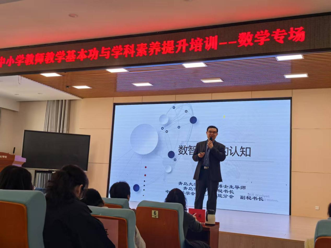 讲座中,杜守强教授从“数智化”背景下的认知重构出发,结合运筹学、大数据分析等领域的实际案例,阐释了数学思维在人工智能、教育决策等场景中的核心价值。让广大中小学教师认识到:数学不仅是基础学科,更是驱动技术创新的‘隐形引擎’。中小学教师需将抽象的数学理论与生活实践结合,培养学生的逻辑思维与问题解决能力。讲座内容涵盖算法优化、数据建模、AI大模型等热点议题,为全市数学教师提供了AI赋能教学的新思路,青岛市各区数学教研员、全市中小学数学教师线上、线下参加培训活动。
