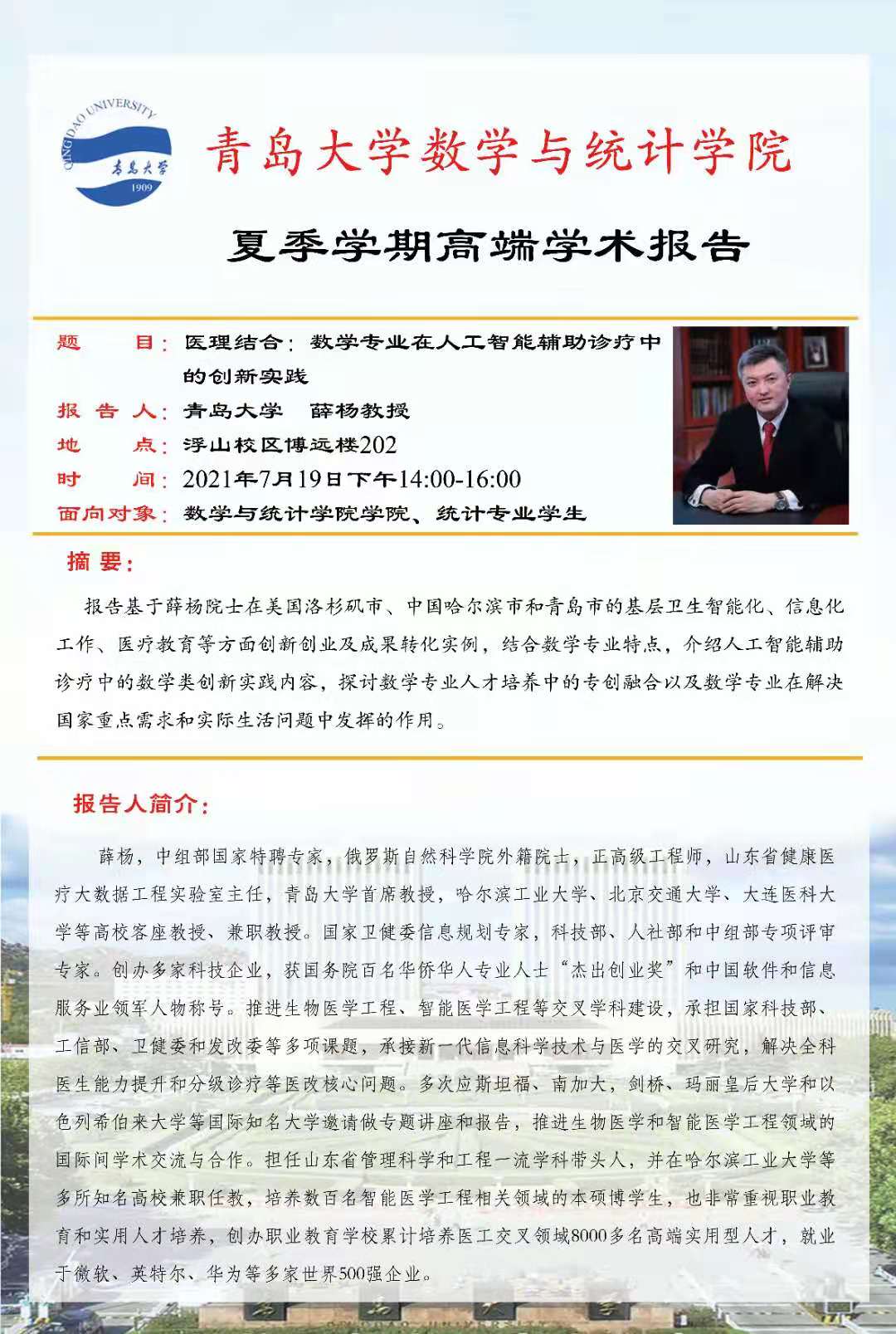 健康医疗大数据研究中心主任薛杨教授作了“医理结合:数学专业在人工智能辅助诊疗中的创新实践”的创新创业类高端学术报告,黄漫